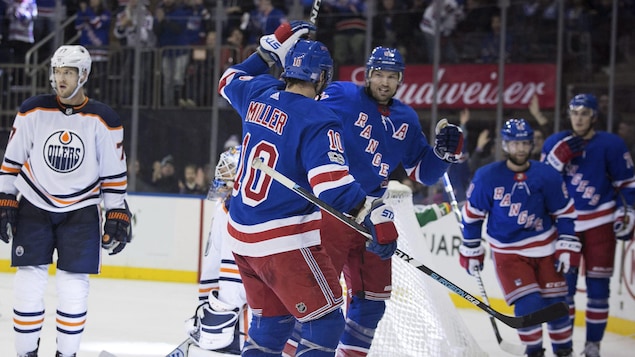 J.T. Miller et Rick Nash célèbrent un but contre les Oilers d'Edmonton. Photo : Associated Press/Kevin Hagen